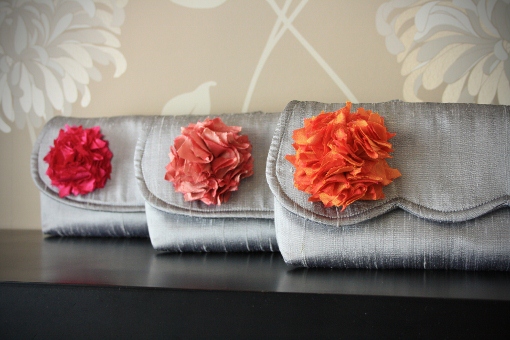 This custom order was created for Amanda. She chose a variety of designs for her bridesmaids and herself. Each clutch has a blossom brooch in a slightly different shade from the family of pinks and oranges. The clutches were lined in two different brightly colored prints and each has a silk name tag inside. Thank-you Amanda, I hope you enjoy!